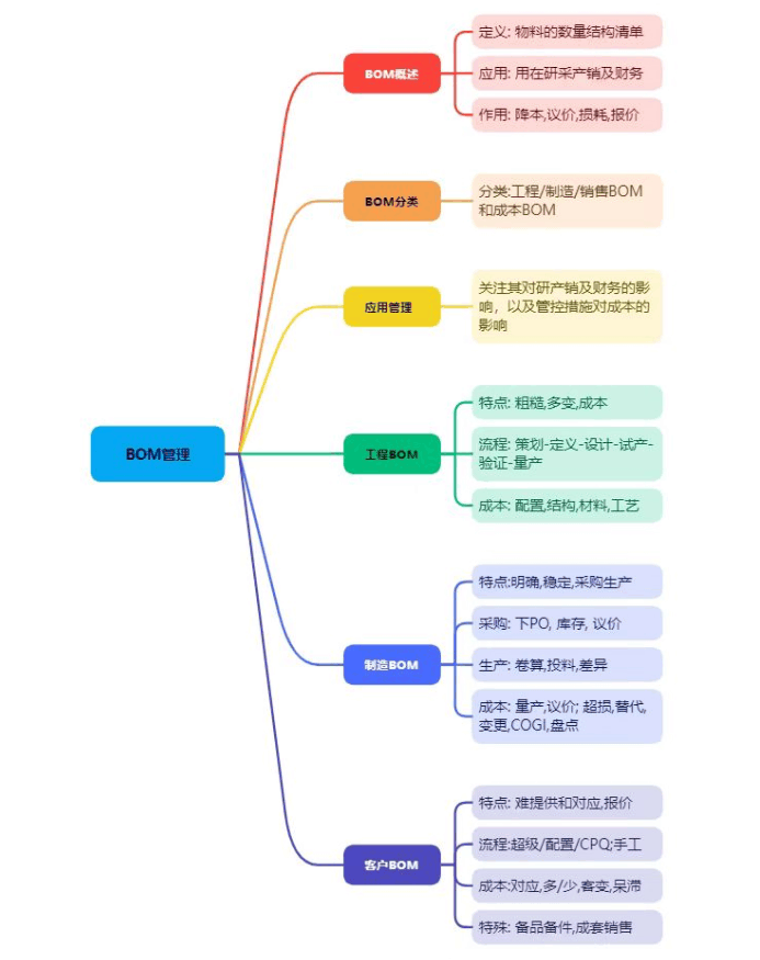 二、BOM分类: BOM按照业务环节,可以怎样分类? 工程BOM (EBOM),研发设计创建,比较粗犷理想,适用产品开发。 制造BOM(MBOM),基于工程BOM细化,指导着制造执行和采购备料等。 销售BOM(SBOM),面向客户可选配置,支持配置报价等。可配置和超级BOM,则是定制化的升级迭代。 另外,还有成本BOM (CBOM) , 记录物料成本和其他费用,用于产品定价和成本控制,适用财务核算和降本增效等。 主要BOM类型就这些,其他的暂时不讲。 三、BOM的应用和管理: 本文主要讲述工程BOM和制造BOM及客户BOM等的应用及管理,关注其对研产销及财务的影响,以及管控措施对成本的影响。 1、工程BOM 应用:工程BOM是在产品研发过程中,从产品角度看产品所需物料零件及组成结构的清单。 特点:一般来说,BOM及层级比较粗糙,后续设计变更较多,影响物料成本也大。 流程:新产品开发流程中,有很多环节和节点,对应BOM不断迭代。产品策划环节,主要看产品需求,以及产品价值等;产品定义环节,主要看产品配置要求,以及技术开发要求;产品设计环节,主要看设计结构、实现方案、材料选择等;产品生产环节,主要看定点定价、生产工艺、作业损耗;产品验证环节,主要看验证结果和异常修正;产品量产环节,则BOM则最终确定下来。 成本:新产品开发过程中,很多环节影响着BOM成本。产品定义和配置,初步确定物料成本区间;产品设计和数模,基本确定材料成本;定点定价和工艺,最终确定材料成本金额。所以BOM研发降本,需要配置优化或功能VEVA,需要结构平台化、通用化、标准化,需要材料易获取、通用高、成本低,需要物料工艺成熟稳定和效率高等。总结一下,在产品开发过程中,BOM不断迭代更新,主要管控物料降本等。 2、制造BOM 应用:制造BOM是在产品制造过程中,从生产角度看产品所需物料零件及组成结构的清单。 特点:一般来说,BOM明确和层级清晰,后续工艺变更很少,影响制造成本和采购备货等。 流程+成本: 采购模块,采购按照BOM需求采购备料,特别是长周期或进口物料,需要及时下PO收货,确保有库存可消耗;资源汇总BOM需求,识别通用和特殊物料,通用按招标、特殊按议价,同时及时维护量产价和更新标准价。 生产模块:工单生产前需要计算半/成品的标准成本,作为工单物料投入的目标;工单生产时需要按实际需求投料到工单里面,作为工单物料投入的实际;工单投料的目标实际差异,需要作为重点管控。 工单物料差异原因,主要有物料的超损、变更、替代,以及单价差异等。超损需要查找原因分类,包含工废、料废、短装等,需要及时处理和改善;短期的替代,需要手工修改工单的物料需求目标;长期的变更,需要走流程做设计变更,工单需要更新后重新下达;另外,物料反冲异常导致消耗异常,需要使用COGI查询;转单或月底要实地盘点,发现实际消耗或库存的异常。总结一下,在采购制造过程中,BOM本身变动较少,主要看采购议价下单,及实际投料消耗,关注物料盘点和呆滞。 3、客户BOM 应用:客户BOM是在销售对外过程中,从内部视角看客户需求和配置所对应的零件及结构的清单。 特点:一般来说,客户定制化的行项目多,对比明细很难提供和对应,影响订单报价及盈利很大。 流程:可以使用超级BOM或可配置BOM,或者使用产品配置器CPQ, 输出定制化的BOM明细;也可以手工输出,前后对比的差异明细等,手工计算成本差异等。 成本:客户化明细行项目,需和配置一一对应,特别关注未开发项和指客户定供;前后差异对比明细,不能多/少/重复提供,不要忽略配套行项目;客户变更涉及明细时,需及时增减明细行项目,不要漏算导致的物料呆滞。 特殊:另外,特殊场景也影响着BOM。客户要求在产品之外,另外赠送些备品备件,不随产品一起发运,则不能作为制造 BOM物料,易导致订单成本部分缺失。产品成套销售时候,按母件定价, 按子件发运,实际未能成套发运,则数量收入成本确认困难。总结一下,在销售对外过程中,BOM需转为内部明细,主要关注报价准确和客变影响等。 总体来讲,本文前面着重讲述了BOM概述、分类、应用及管理等,希望能给同行一定的帮助和借鉴。强调一下,工程BOM决定着物料成本,需要严抓研发降本;制造BOM关联着实际消耗,需要管控投料异常;客户BOM影响着报价准确,需要做好报价和客变管理等。另外,不同行业和公司及场景,有着不同的情况,需具体问题具体分析。本文仅做为参考,希望自己的经历和思考能给大家带来帮助。请求同存异,不喜勿喷。谢谢。