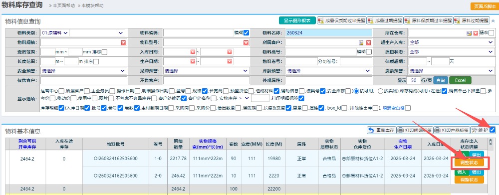 进入界面后,搜索需要调整的库存,勾上“维护”按钮,点击对应明细后面的“调整状态”按钮,如下图: 进入界面后,修改对应的片数,需要多少片,填写多少数量