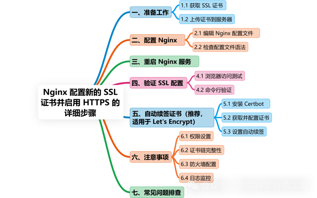 ​以下是在Nginx配置新SSL证书并启用HTTPS的详细步骤,适用于手动安装证书或结合LetsEncrypt自动管理的情况:1.准备工作1.1获取SSL证书•证书来源:○从证书颁发机构(CA)购买证书(如阿里云、腾讯云、DigiCert等)。○使用LetsEncrypt免费证书(推荐)。○生成自签名证书(仅用于测试环...