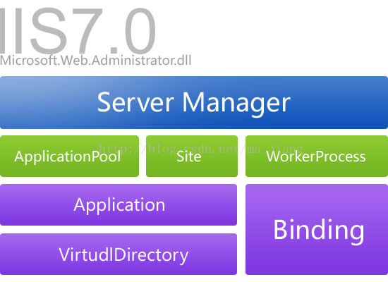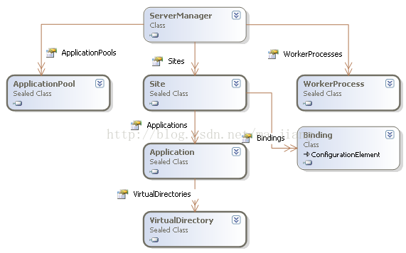 本文热度 2671 |  利用IIS7自带类库管理IIS现在变的更强大更方便,而完全可以不需要用DirecotryEntry这个类了(网上很多.net管理iis6.0的文章都用到了DirecotryEntry这个类 ),Microsoft.Web.Administration.dll位于IIS的目录(%WinDir%\\System32\\InetSrv)下,使用时需要引用,它基本上可以管理IIS7的各项配置。 这个类库的主体结构如下: