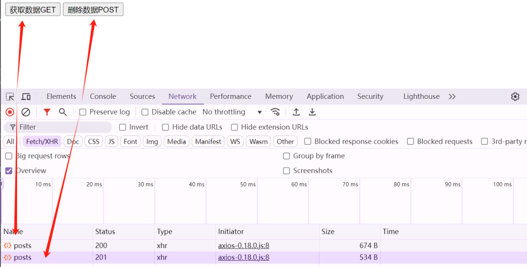 点击网络中的XHR请求,发现可以抓包到我们发送的Ajax请求,XHR代表的就是异步请求。