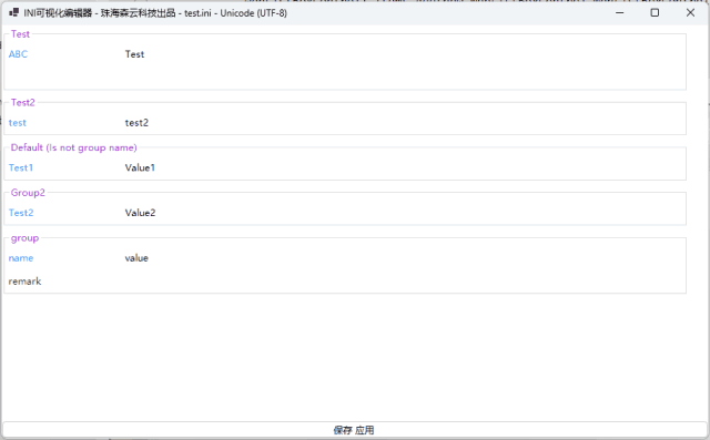 var ini = new Ini("test.ini");ini["Test1"] = "Value1";ini["Group2", "Test2"] = "Value2";var test1 = ini["test1"];var test2 = ini["group2", "test2"];ini.AddItem("group", "name", "value");ini.AddRemark("group", "remark");ini.Show();