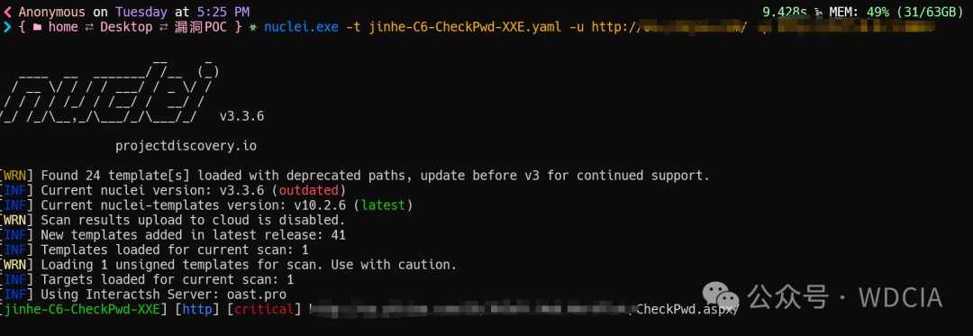 金和 C6 CheckPwd.aspx 存在XXE漏洞![]() 01 漏洞介绍 金和OA C6 CheckPwd.aspx 接口处存在XXE漏洞,它可以允许攻击者利用 XML 解析器的漏洞来执行任意文件读取、远程文件包含、端口扫描等攻击,从而导致敏感信息泄露、拒绝服务,甚至远程代码执行等严重后果 ![]() 02 影响版本 ![]() 03 测绘语法 Fofa测绘语句: 04 POC 阅读原文:原文链接 该文章在 2025/8/5 18:59:07 编辑过 |
