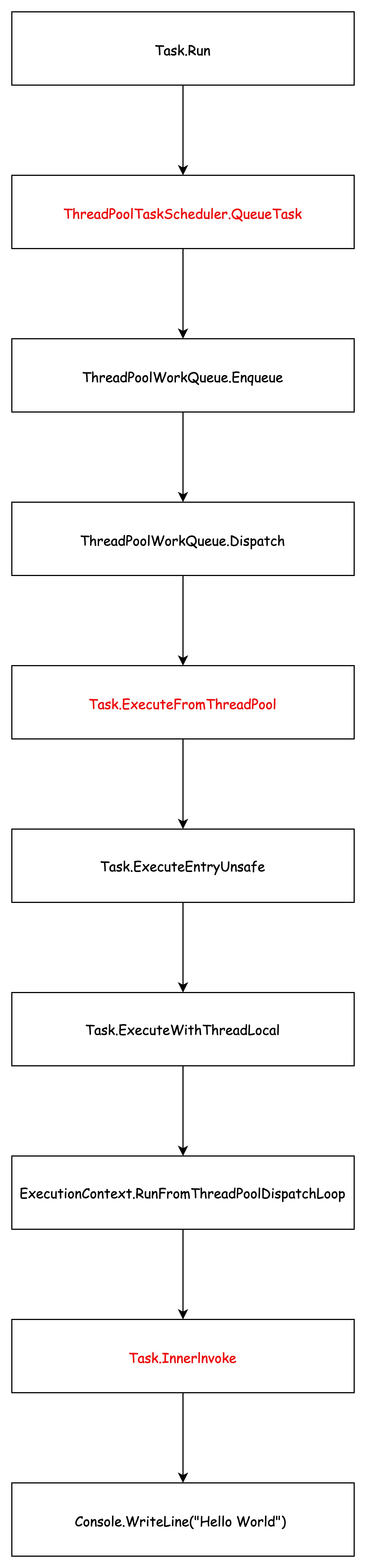可以看到 Task 以 ThreadPoolTaskScheduler 为媒介,进入了 ThreadPool。ThreadPool 调用 Task.ExecuteFromThreadPool 方法最终触发 Task 所封装的 action 的执行。