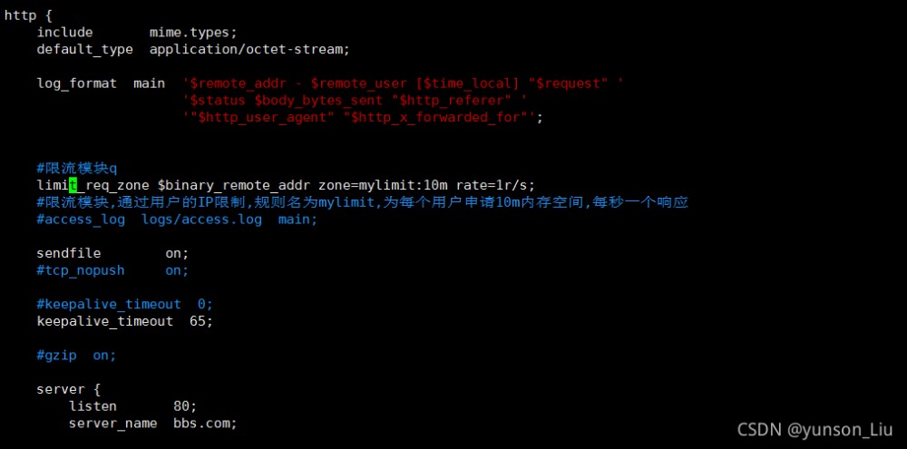 • 第二个参数:zone=mylimit:10m表示生成一个大小为10M,名字为one的内存区域,用来存储访问的频次信息。