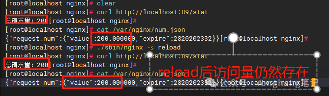 查看 state 文件中的访问量,cat /var/nginx/num.json,返回 {"request_num":{"value":200.000000,"expire":2819531276}}