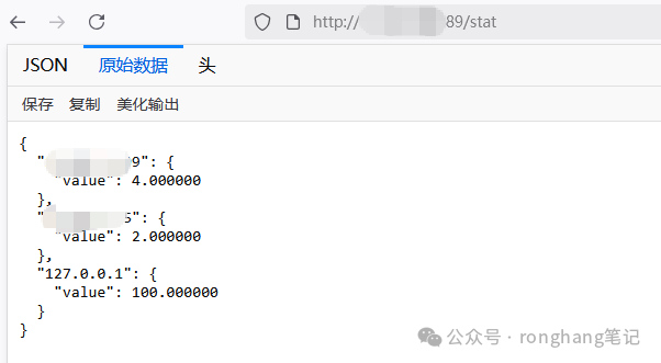 接口查看访问量, curl http://localhost:89/stat, 返回 总请求量:200