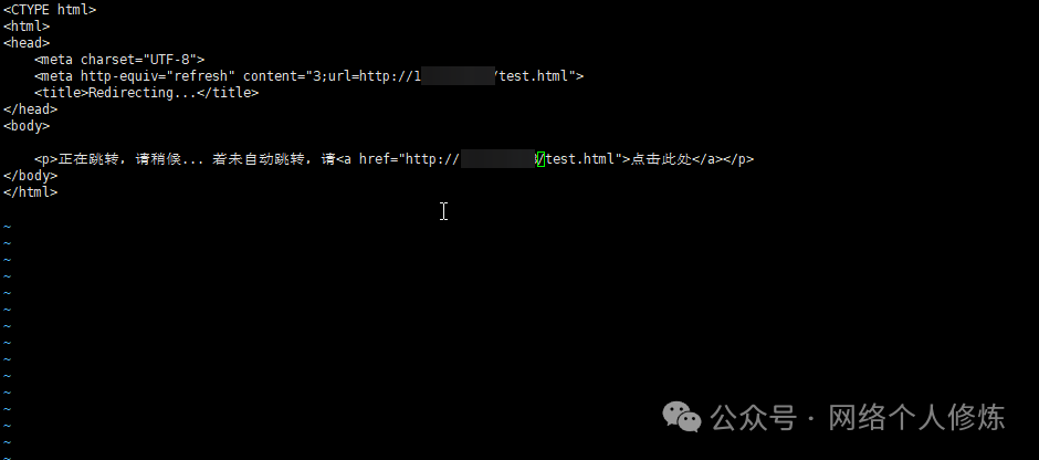 其中content="3;url=..."表示 3 秒后自动跳转到目标 URL,可根据需求修改等待时间和目标地址。 配置完成后,确保 Nginx 配置中指定该页面为默认索引页,并重新加载配置:
