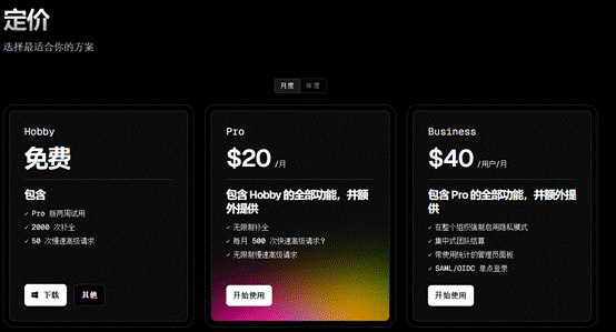Cursor 的 agent 模式可以端到端完成任务,实现快速开发。 软件团队也整理了一些使用方面的博客内容,我们也可以借助相关内容完成更好地操作。 但是,目前软件对于模型的免费调用次数有限制,并非完全免费,下图为具体使用费用明细。