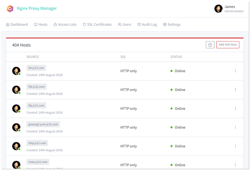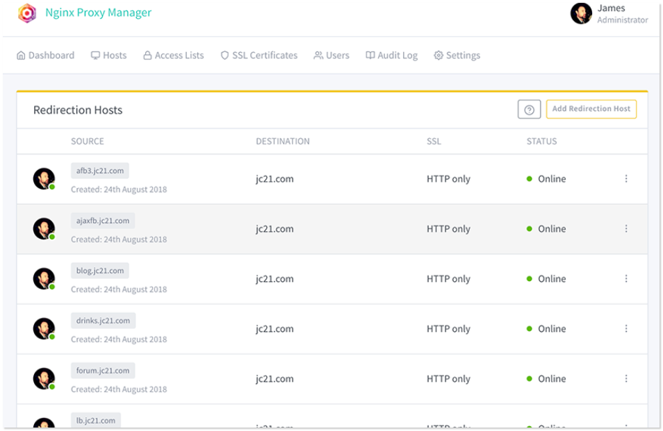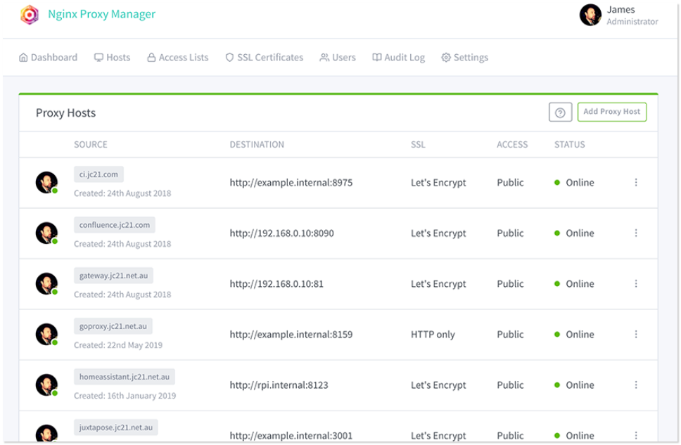 • 访问控制与权限:可以创建访问列表(Access Lists),限制哪些 IP 地址或者用户可以访问特定的代理主机。还支持基本的 HTTP 用户名密码认证,为你的服务多加一层保护。