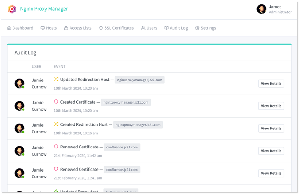 • 用户管理、权限和审计日志:nginx-proxy-manager还提供了用户管理、权限控制和审计日志功能。你可以创建多个用户账号,为每个账号分配不同的权限,确保只有授权的用户才能访问和修改配置。同时,它还会记录所有的操作日志,方便你随时查看和审计。