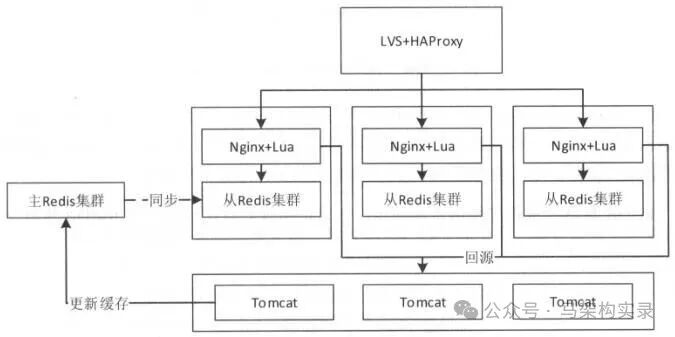 第一步先读取Redis集群。如果不命中,则回源到Tomcat集群(其会调用数据库、服务总线获取相关数据) 来获取相关数据。redis集群会进行多机房主从同步,各自机房读取自己机房的从redis集群,如 下图所示。