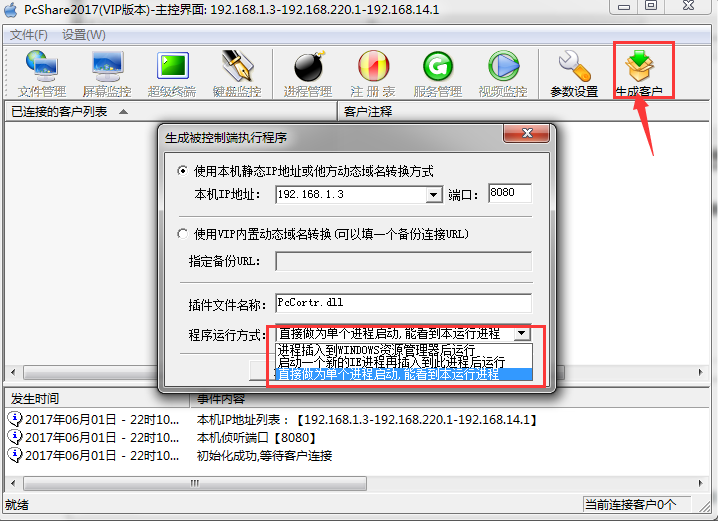 2. 生成被控制端宿主程序,点击控制端主界面上的“生成客户按钮”: