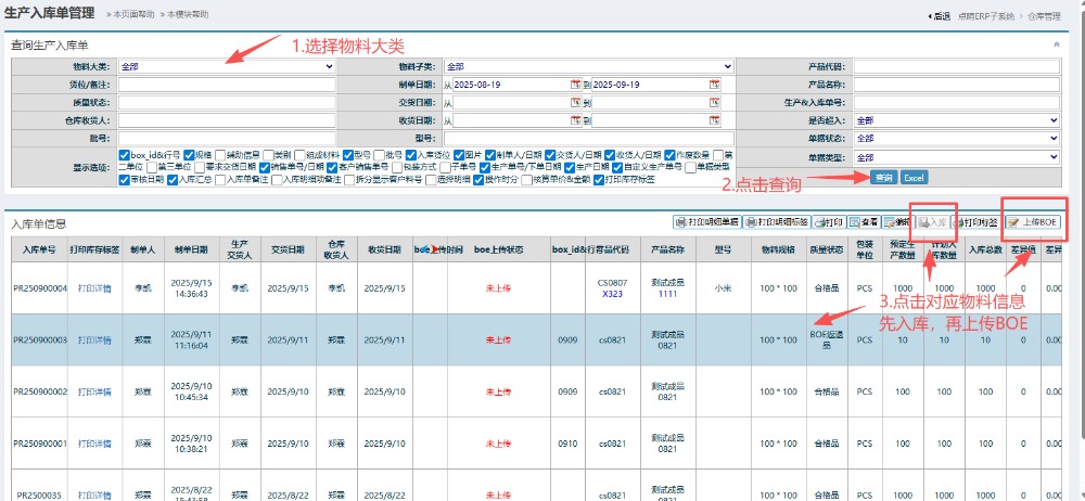 6.进入界面后,按图操作:点击选择物料大类,点击查询。然后点击对应物料信息,先进行入库,再上传BOE