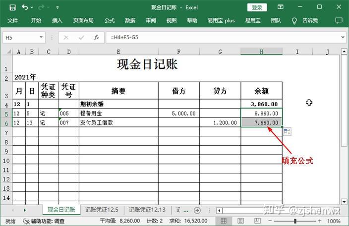 (1)选中H5单元格;(2)在编辑栏中输入“=H4+F5-G5”,表示库存现金的本日余额=上日余额+本日借方发生额-本日贷方金额。