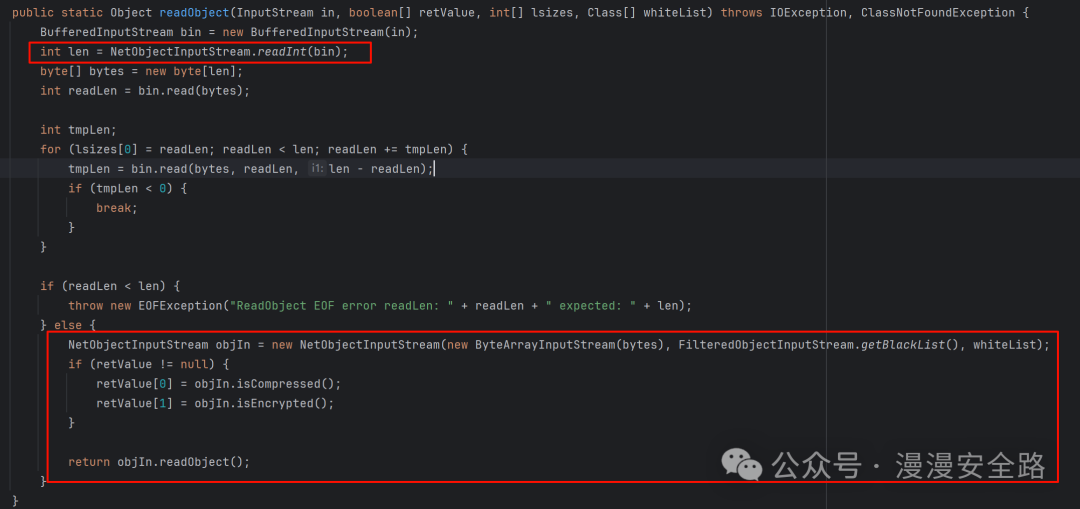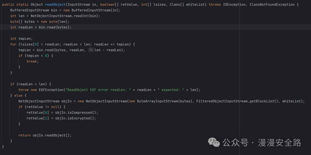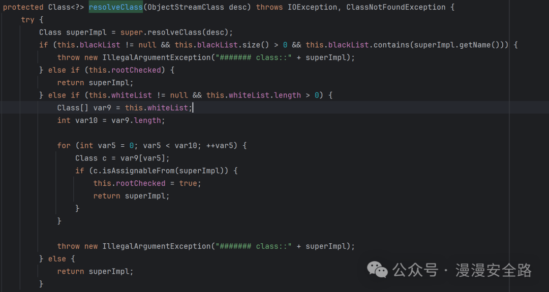 此处添加了黑白名单判断,且传入的rootCheckedfalsewhiteList为我们刚才传入的InvocationInfo.class所以这里使用白名单修复了之前的反序列化漏洞 然后我们回到readObject这里研究一下怎么生成这个序列化数据