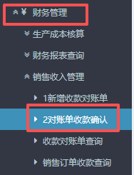 4.提交后,回到左侧的功能菜单找到“财务管理”,点击“销售收入管理”,点开“对账单收款确认”。