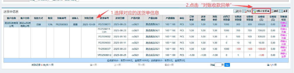 6.查询得到当前的单据状态,选择对应的送货单信息,点击“对账收款回单”。