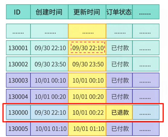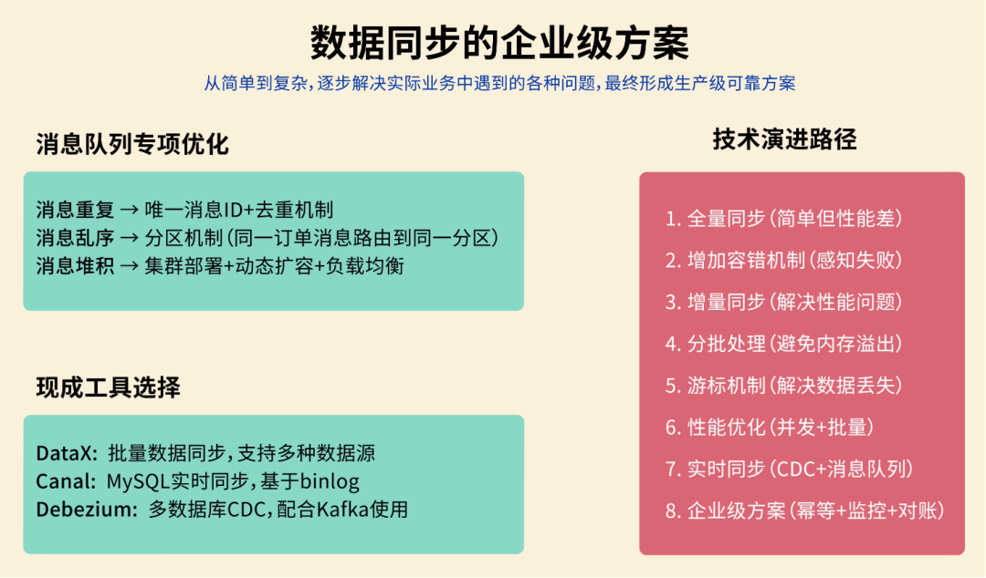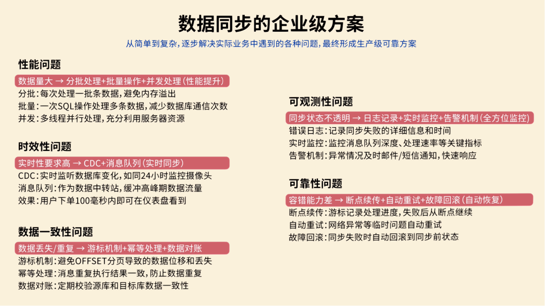 查询结果返回订单 A(08:00)和订单 B(09:00),同步完成后将偏移量调整为下一页 可就在查询下一页前,订单 B 因为 “修改订单状态” 被更新,这时订单 B 的更新时间就不在查询范围内了。 这就导致查询下一页 ![]() 怎么解决这个问题呢? 这可难不倒你小阿巴,既然 动态数据集 中使用 SQL 自带的 OFFSET 偏移作为分页起点会出问题,那不妨 自定义一个标志来记录下一批要同步的起点。 这就是游标机制。 比如我约定自增的主键 id 作为游标,每查询一批数据之后,把这批数据的最后一条记录作为新的游标值;查询下一批数据时,只查询 id > 游标的数据。 ![]() 这样不仅防止数据丢失,还避免了 OFFSET 深度分页带来的性能问题。 此外,如果把游标想象成进度条的断点,可以更清晰地记录同步进度,失败后可以从断点继续。 做完这一通优化后,你长吁了一口气,工作看来是保住了。 ![]() 性能优化你以为终于可以安稳一段时间了。但没想到,公司的好日子才刚刚开始。 随着老板大力扩张业务,公司每天的订单量可以达到百万条,你的同步任务每次要跑几个小时才能完成。 更要命的是,老板现在对数据的依赖越来越强,要求每隔 2 个小时就要同步一次数据! 怎么能够让任务执行更快呢? 这时,你想起了曾经在 程序员面试神器 - 面试鸭 上背过的各种性能优化八股文。好家伙,终于能派上用场了! ![]() 首先,修改插入数据库的操作方式。之前是一条一条地插入订单数据,改为执行一条批处理语句来同时插入同一批内多个订单数据,减少了跟数据库通信的次数,性能大幅提升。 ![]() 但是你觉得还不够快,于是优化了批处理的流程。之前是等一批同步完再同步下一批,串行执行;现在你启动了多个线程,每个线程负责处理一批订单的同步,多个线程可以同时搬砖干活,效率大幅提高。 ![]() 这一通操作下来,老板都激动了:“小阿巴,你这技术可以啊!好好干,我给你升职加薪!” 你笑了,有了老板这句话,你想继续努力给公司卖命了。 ![]() 实时同步两年后,随着你头发的消逝,公司总部决定要上市了! ![]() 老板找到了你:“阿巴阿巴,咱们的数据同步能不能做到实时?我想给投资人展示实时的业务监控。最好是用户刚下单,投资人立刻就能在大屏幕上看到!" ![]() 你早料到会有这个需求,帅气地甩出一句话:“交给我吧,我让你见识一下企业级方案!” ![]() 这两年你也没闲着,像实时数据分析这种典型需求的实现方案,你早已烂熟于心。 普通的定时任务已经无法满足实时性的要求,只能搬出 CDC + 消息队列 这两大杀器了。 CDC(Change Data Capture)就像给数据库安装了一个 24 小时实时监控的摄像头,数据有任何变化,摄像头都能立刻发现。 消息队列就像一个快递中转站。数据库变化的消息先发送到这个中转站,然后同步数据的程序从中转站取出数据并写入到数据分析仓库中。 ![]() 有了中转站后,如果消息特别多,程序来不及处理,也不会丢失数据。 实现了这套方案之后,用户只要一下单,100 毫秒内老板就能在仪表盘上看到。而且保险起见,你还给消息队列加了个监控,如果消息堆积太多,就会自动告警。 他开心得像个孩子:“小阿巴,我给你升职加薪,还给你带新人!” 你又笑了,开始幻想着你和新人坐在高高的办公桌上,你给他讲述自己光辉事迹,他向你投来羡慕的目光。 ![]() 方案完善半个月后,公司迎来了双十一大促活动。 你正在和新来的实习生阿坤吹牛皮,没想到瞬间产生了大量订单,像洪水一般,让你的实时同步系统出现了各种异常: