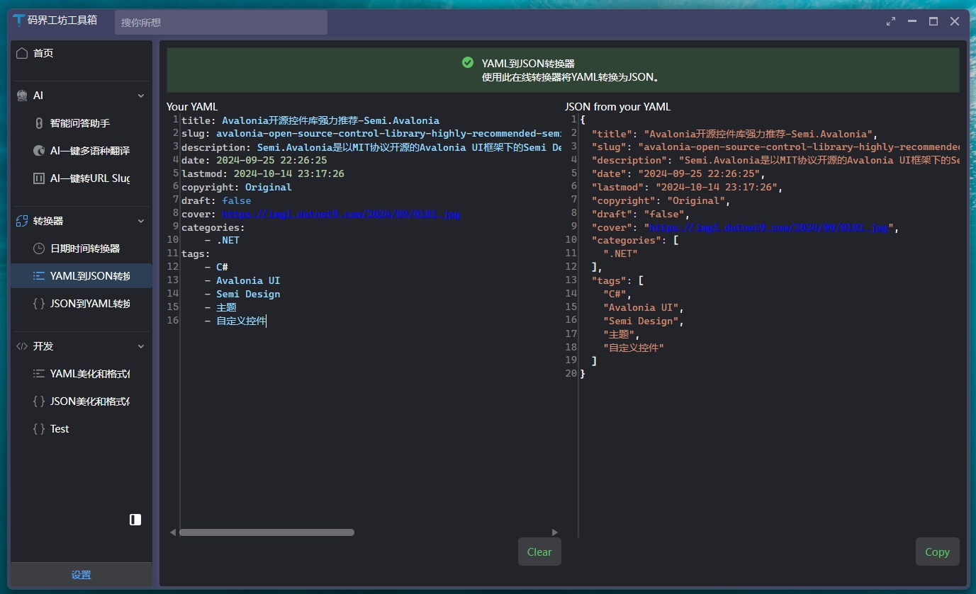 同时,包含实用的 Json 美化工具和 YAML 转 Json 工具,分别如下图所示: