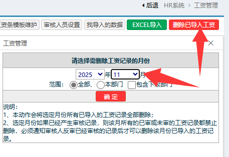 如果该月存在审核过的记录,就需要先反审,具体是前往工资审核,找到已审核的记录点反审,再回到上面的位置删除。