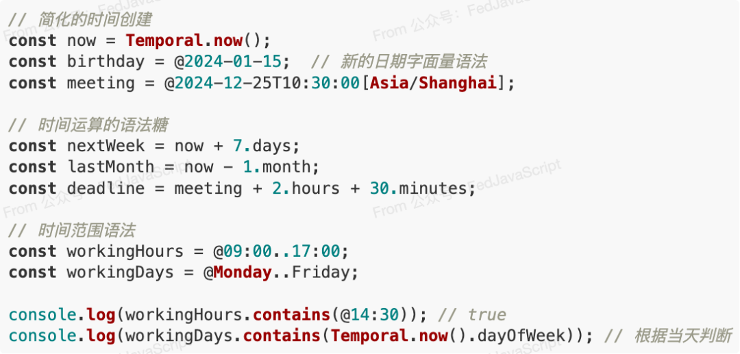 虽然Temporal API本身不是ES2025的新特性,但ES2025对其进行了语法糖的增强: