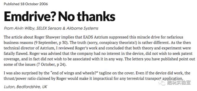 而且,当时有了试验成功之后 索耶尔叔叔并没有在 任何有学术认可的杂志期刊上 以自己的名义发表过 关于无工质微波推力器的论文 原因很简单: 要在杂志期刊上发文章 是需要有学术经历 是需要有同行愿意来评议他的文章的 而索耶尔叔叔是一个 毫无学术背景的爱好者而已。。 他根本没有机会发表文章 这一切都仿佛让人联想到了 “民科”这两个字。。