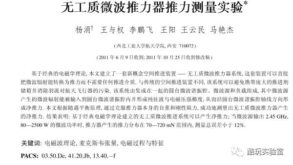 图:2006年10月18日,New Scientist杂志刊登了对无工质微波推力器的批评文章 就这样,索耶尔叔叔再次难逃 被扣上“民科”帽子的厄运 他就这样一直受尽嘲笑和冷眼 几乎没有人给他的发明任何支持 直到2010年。。 一伙带有神奇东方力量的 吃瓜群众加入了!! 远在中国的西北大学杨涓教授 关注到了无工质微波推力器这个机器 也看到了学术圈的相关讨论 觉得很有意思 也许她和蛋蛋姐一样 有一颗吃瓜群众的八卦之心 正在熊熊燃烧 于是2013年,她带领一支队伍 制作出了无工质微波推力器原型机 并发表论文(中文)公布测试结果: 2.5千瓦的电量产生了 720毫牛(约72克)的推进力。