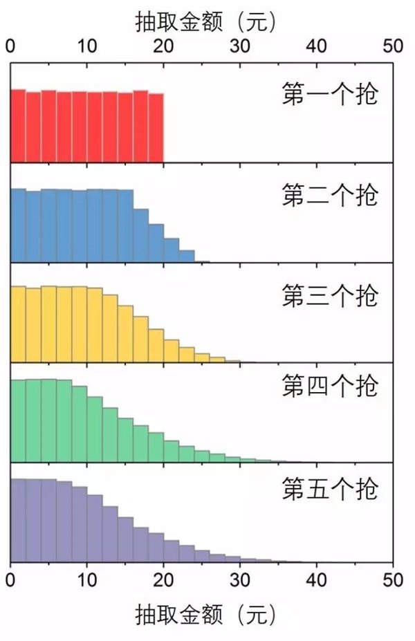 图8.不同先后顺序抢到的金额分布图(五万次模拟)