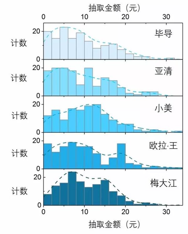 图4.五个人抢到的金额频数分布直方图 呃……至少五个人都能抽到大红包……脸还不算太黑……那么究竟谁最厉害呢?请看下面的散点图以及表格数据