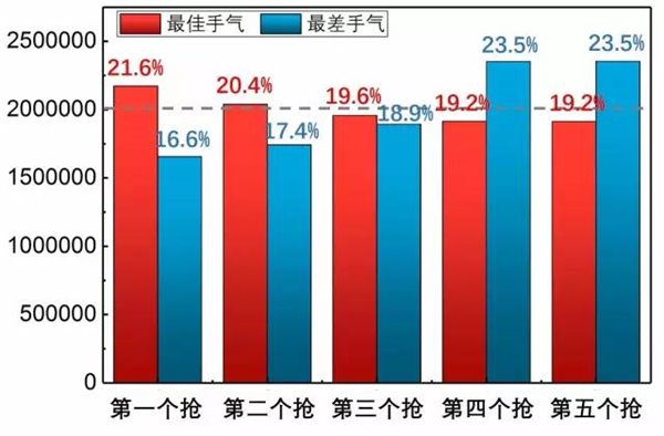 图10.不同先后顺序下抢到的手气最佳、最差(一千万次模拟) 看来先后顺序对抽到“手气最佳”是有决定性影响的! 5个人抢红包的时候,越先抽,抽到“手气最佳”的概率越大!第1个人抢到手气最佳的概率是21.6%,而最后俩人的概率只有19.2%!相反,第1个人抢到手气最差的概率是16.6%,最后俩人的概率高达23.5%! 不过只有5个人抢的时候有这个规律。 当参与抢红包的人数变化时,“手气最佳”的概率随着先抢后抢顺序变化的规律也是不一样的。