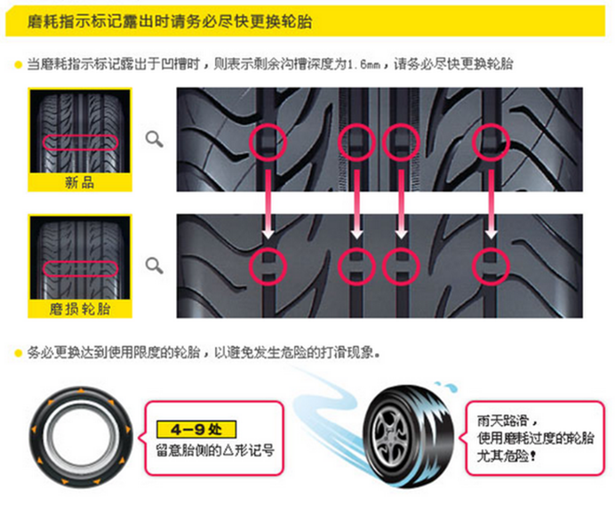 ——————————分割线——————————— 必须知道的轮胎知识(来源:米其林、普利司通、邓禄普、固特异等一线轮胎官网) 1、胎压: 每一个月和跑高速/长途前检查胎压,可以降低油耗,保持性能,并避免高速爆胎事故,合适的胎压应按照汽车的胎压要求,而不是按照轮胎上标识的最高胎压。 (轮胎气压超出或低于标准10%,轮胎寿命减少4%左右;但气压超出20%轮胎寿命减少25%,低于标准20%轮胎寿命减少20%!) 车身胎压要求一般写在: 车辆使用说明书 车门侧面或车门立柱侧面 油箱盖内侧 储物抽屉门内侧 手抓脚踢不靠谱,检查胎压一定要用胎压表,几十元一个保你平安!重要的事情我不说三遍。 2、胎纹磨损: 轮胎沟槽深度少于1.6毫米或轮胎表面与磨损指示块持平,必须更换。