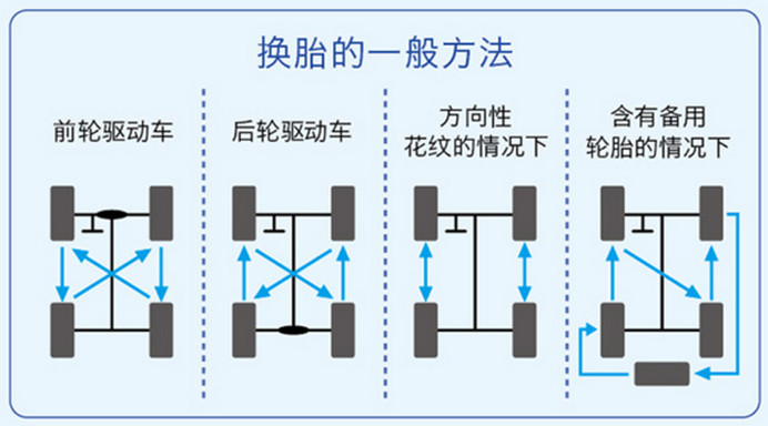 3、以下情况必须换胎 轮胎沟槽深度少于1.6毫米或轮胎表面与磨损指示块持平,必须更换。 侧壁破损 胎面、侧壁鼓包或变形 胎面有直径大于6毫米的穿透性刺扎 轮胎使用5年以上要定期检查轮胎状态(已经不太靠谱了),哪怕是未使用的备胎或者库存胎,到10年也必须报废。 4、轮胎换位4种方法 定期换位(5000-10000公里1次),让轮胎均匀磨损,延长寿命。