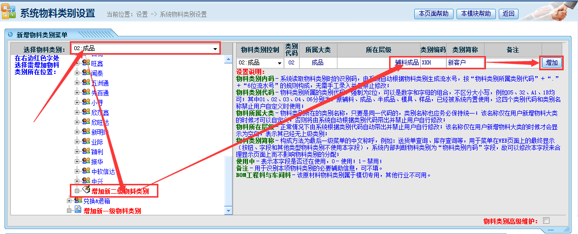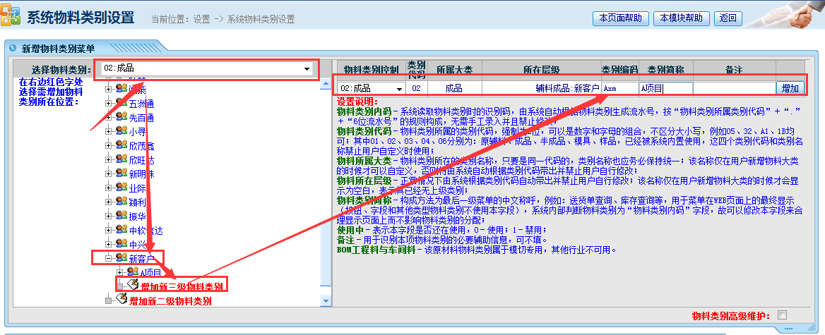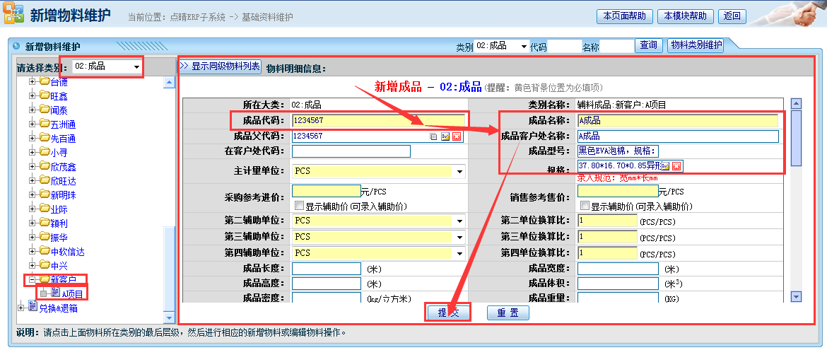 新客户,新项目建资料流程说明(分客户、项目俩级,需依次建类别) 步骤1、新增客户类别 操作菜单位置:系统管理——物料管理——物料类别维护,进入下图所示页面: 如上图所示操作流程:左侧选择物料类别位置选择“成品”——点击展开辅料成品——在最下方点击“增加二级物料类别”——录入客户编号和客户名称(客户编号可用拼音缩写)——点击增加完成。 步骤二、新增项目(型号)类别 操作菜单位置:系统管理——物料管理——物料类别维护,进入下图所示页面: 如上图所示操作流程:左侧选择物料类别位置选择“成品”——点击展开辅料成品——找到新客户展开——在最下方点击“增加三级物料类别”——录入项目编号和项目名称(项目编号可与项目名称一致或录入缩写)——点击增加完成。 步骤3、新增成品详细信息 操作菜单位置:系统管理——物料管理——新增物料,进入下图所示页面: 如上图所示操作流程依次为:左侧类别选择“成品”——找到对应的客户(以新客户为例子)——展开并点击对应的项目(以A项目为例子)——录入成品代码(以客户提供代码为准)——录入成品名称(以送货单打印名称为准)——录入成品型号——录入规格(填键键通尺寸)——录入单位——点击提交完成。 说明: 1、若客户为旧客户,项目为新项目,则只需操作步骤2、3; 2、若客户为老客户,项目也是旧项目只是新增成品资料,则按操作步骤3操作即可 点晴模切ERP更多信息:https://moqie.clicksun.cn,联系电话:4001861886 该文章在 2017/7/10 15:11:36 编辑过 |