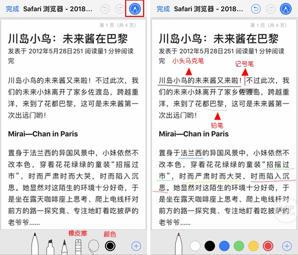 点击右上角的「标注」,就可以直接在 PDF 上圈圈画画。有三种粗细不同的笔(小头马克笔、记号笔、铅笔)和六种颜色可供选择。