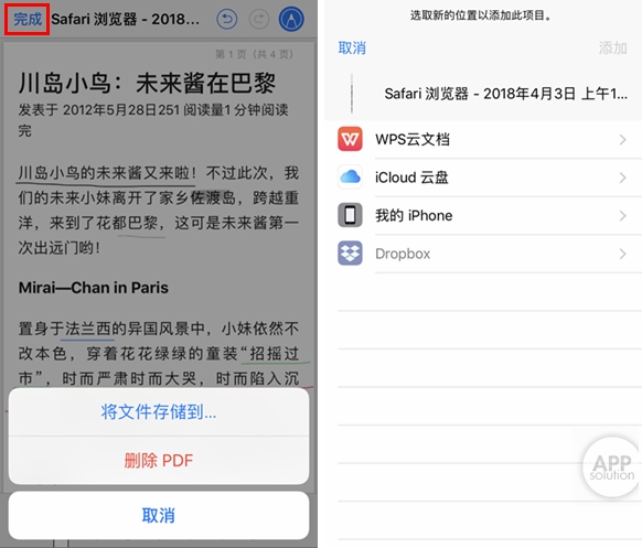 而点击右上角的「完成」,则可以选择保存文件或将 PDF 删除。