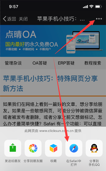 如果我们在网络上看到一篇好的文章,想分享给朋友。如果是一些敏感网页,可能分分钟被微信屏蔽或者被发布者删除,或者分享之前又想做标记,怎么办才最简单快捷?Safari 有一个功能:可以直接把整张网页保存成 PDF,并且支持在上面做标注。 在微信中点击右上角更多图标,会看到“在Safari中打开”: