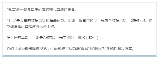 比如,解一套微积分题,电脑可以秒出结果;但识别放在面前的是一棵小树还是一株大草,对于电脑而言则极端困难;架构一套金融市场的策略模型,对它来说轻而易举;而读懂幼儿的图书、真正理解各种词意——谷歌为此花了几十亿美元,还没做出来。 人类觉得特别容易的事情——视觉、动态、移动,甚至直觉,对于电脑而言难于登天。伸手拿起一件东西,是人类在经过几亿年的进化后,不需要思考便能完成的事情。我们有着全宇宙已知的最复杂的东西——人脑,各处肌肉和关节、以及视觉,在人脑的指挥下瞬间配套完成各种物理工作,这是人类的本能。 这种本能,对于电脑而言恰恰是最难的——现在的电脑连网站的验证码都看不懂,能分辨猫狗的计算机,就能称得上“超级”AI。 看懂、听懂都做不到,怎么能进化成强AI?因此,弱AI的首要难点,便是解决包括计算机视觉在内的各类“基础”问题。 AI从看、思考到做出反应,是一个非常复杂的工程。业内反复强调的“深度学习”、“增强学习”、“大数据”等,在这个工程里是相辅相成的,真正有价值的研究均离不开其支撑。而在这些之下,最最关键的则是逻辑原理和核心算法。 世界的尽头是物理,物理的尽头是数学,这句话同样适用于AI。AI的突破基于逻辑的支撑和算法的突破,在这个基础上,“喂食”数据才有意义。比如,你教会了电脑如何对比、归纳总结一万条狗的特征,它才能识别出狗;反之,它就算看了十万条狗,也是白看。 “科普”结束,主角登场。华捷艾米之所以被称为“全球三强”,根基是它在核心算法的基础上,赋予计算机以立体视觉,进而研发出了拥有全套自主知识产权的3D-AR解决方案。