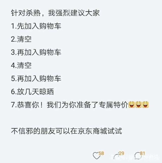 最近关于“大数据杀熟”的新闻引发很多网友关注,不少用户发现,使用打车软件出行、通过订票网站预订电影票,网上购物等,等级高的常客,反而要支付更高的价格;而很少使用相关服务的新顾客,却能享受到较低的价格。 如何才能让自己不被大数据杀熟,一名网友发帖称:针对杀熟,我强烈建议大家试试按下面的步骤操作一下: 1、先加入购物车 2、清空 3、再加入购物车 4、清空 5、再加入购物车 6、放几天晾晒 7、恭喜你!我们为您准备了专属特价 不信邪的朋友可以在京东商城或者淘宝上试试。