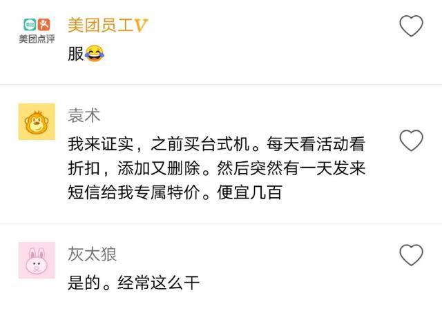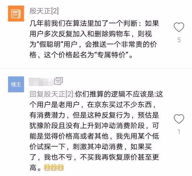 也有在职的大数据工程师表示:几年前我们在算法里加入了一个判断,如果用户多次反复加入和删除购物车,则视为“假聪明”用户,会推送一个非常贵的价格,这个价格起名为“专属特价”。 楼主称:你们的推算逻辑不应该是,这个用户是老客户,在京东上买过不少东西,有消费潜力,但是这种反复的行为,预估是犹豫阶段且没有上升到冲动消费阶段,可能是觉得价格高或者其他,我先用某个低价试探一下,刺激其消费冲动,如果买了,我也不亏,不买我再恢复原价甚至更高。