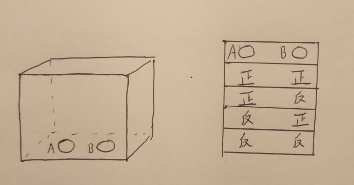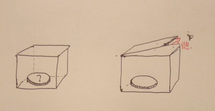 假如说一个盒子里有两个硬币,而这两个硬币的状态是随机的,那么在打开盒子前,盒子里面就有如图的四种可能。