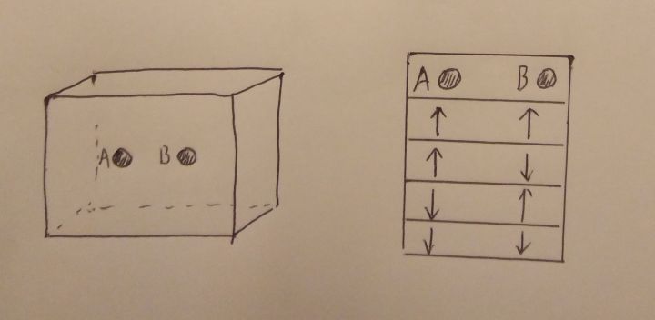 一个电子类似于硬币,也是有两种状态,上旋和下旋。 一个盒子里有两个电子,这两个电子的状态也是随机的,那么在打开盒子观察前,盒子里的电子也是有如图的四种可能。
