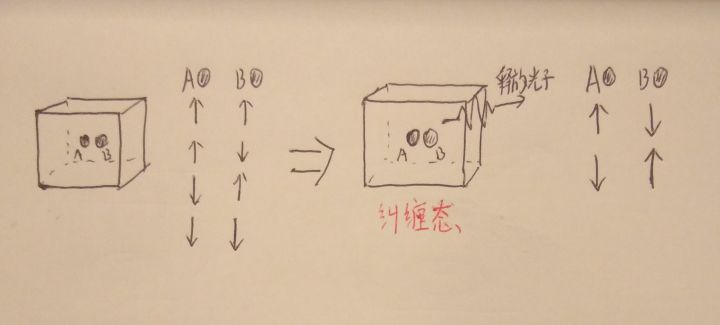 但是电子特殊的一点是,当两个电子靠的足够接近的时候,它们两个就可能发生一种变化,它们会释放出一个光子,同时两个电子进入了一个纠缠状态。此时两个电子就不是有四种可能,而是变成如图的只有这两种可能了,就是说两个电子的状态一定是相反的。