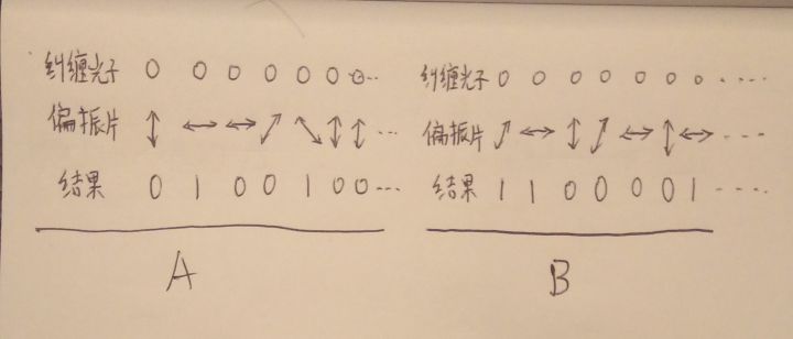 第一步,A和B首先对依次收到到纠缠光子对进行处理,通过一组随机生成的偏振片。看是否能通过得到一组数据。