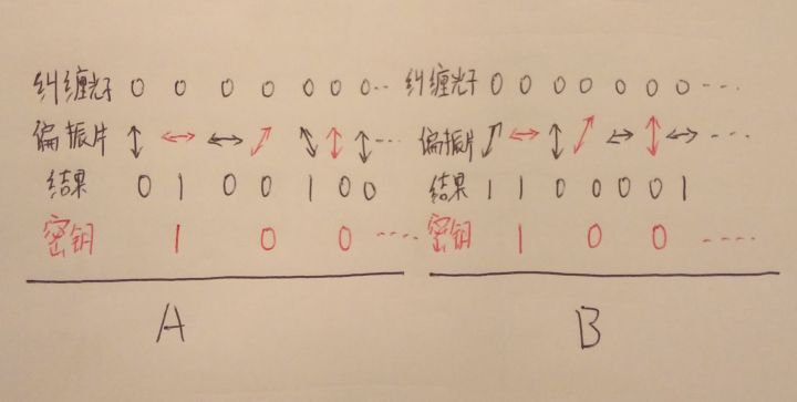 第二步,A和B互相把自己所用的偏振片组通过经典信息途径传递传递给对方,这样偏振片不相同的那些数据就被舍弃,A和B就得到了一组完全相同的,只有他们自己知道的密钥。