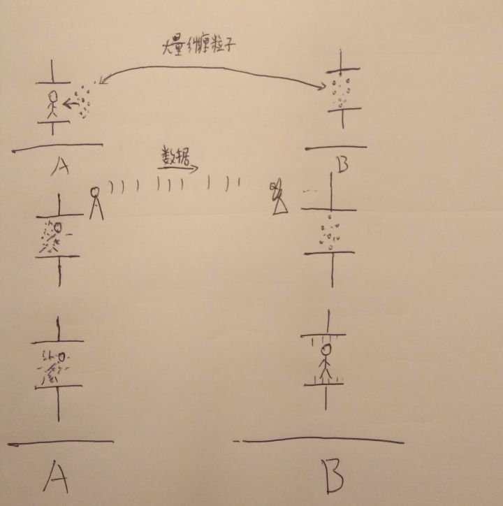 过程就是,A处和B处有大量互相纠缠的粒子,A处的人和纠缠粒子相互作用并被摧毁(根据量子学定律这是必然的)。一系列数据通过经典途径以光速传到B,然后遥远的B处利用这些纠缠粒子和从A传过来的数据生成了一个和A处完全相同的人,这个人拥有原来那个人所有的记忆和意识,他只觉得自己突然间从A 传到了B。 怎么理解量子隐形传输呢?