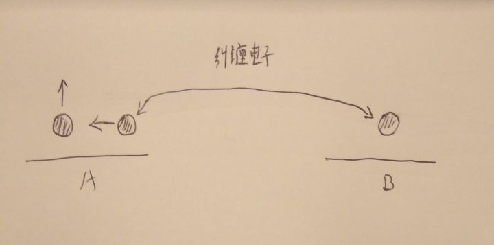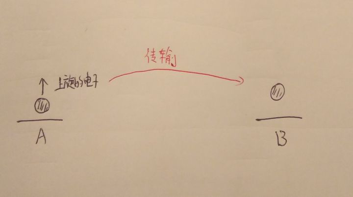 第一步 我们需要在A和B有一对纠缠的电子,我们把A处的纠缠电子同需要传输的电子放到一起。