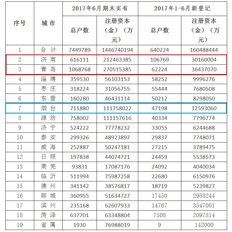 从上面数据可以看出,成都在四川具有绝对优势,市场主体占了全省的将近40%,新增市场主体则占了45%,新增注册资本则占了61%。很显然,资金和人口在加速向成都集中。 在这样的省份买房子,只能选择成都,其他任何一个城市都无法跟成都抗衡。 再来看看山东的情况: