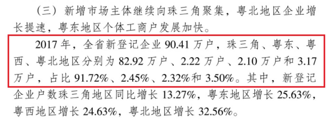 上图是截至2017年上半年末的市场主体分布情况,可以看出山东经济高度均衡,济南的市场主体数量,竟然只能在省内排第五名,不但比青岛、烟台少,还比潍坊、菏泽少。而临沂、济宁的市场主体数量,也跟济南差距不大。 但值得注意的是,新增市场主体济南位居第一,新增注册资金也遥遥领先于除了青岛之外的其他城市。这说明人口和资金有向济南集中的趋势,事实上济南汇聚的“资金总量”在过去几年已经超过了青岛。省会城市的优势,正在慢慢发挥作用。 下面是截至2017年末,广州、深圳和广东省的市场主体数量: 1、广东省市场主体1026万户,其中企业420万户; 2、深圳市场主体306万户,占全省30%;企业177万户,占全省42%; 3、广州市场主体175万户,占全省17%,企业数量不详。 由此可见广东省的创业中心显然是深圳,深圳企业数量或许已经达到了广州的近两倍!另外,东莞的市场主体数量大幅超过了佛山,虽然东莞GDP和资金总量仍然低于佛山,但企业数量的大幅超越,可能预示东莞经济比佛山更有活力。 至于广东全省,企业注册高度集中在珠三角(见下图)。这告诉我们,珠三角之外没有楼市可言,只有房子。