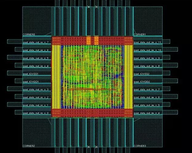 最后,将合成完的程式码再放入另一套 EDA tool,进行电路布局与绕线(Place And Route)。在经过不断的检测后,便会形成如下的电路图。图中可以看到蓝、红、绿、黄等不同颜色,每种不同的颜色就代表着一张光罩。至于光罩究竟要如何运用呢?